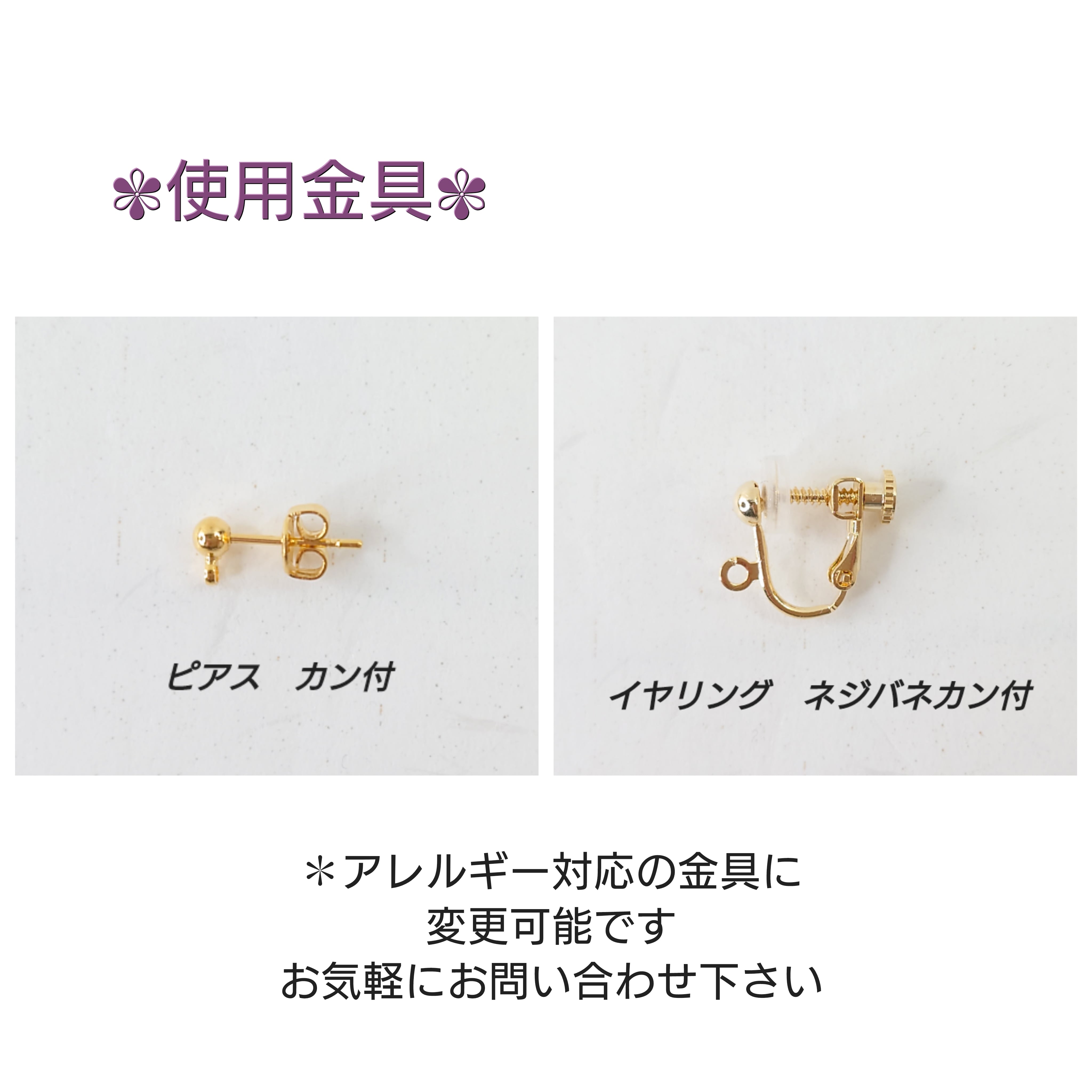 金属やレジンを使用しておりますので、アレルギーの方はご注意下さいませ。