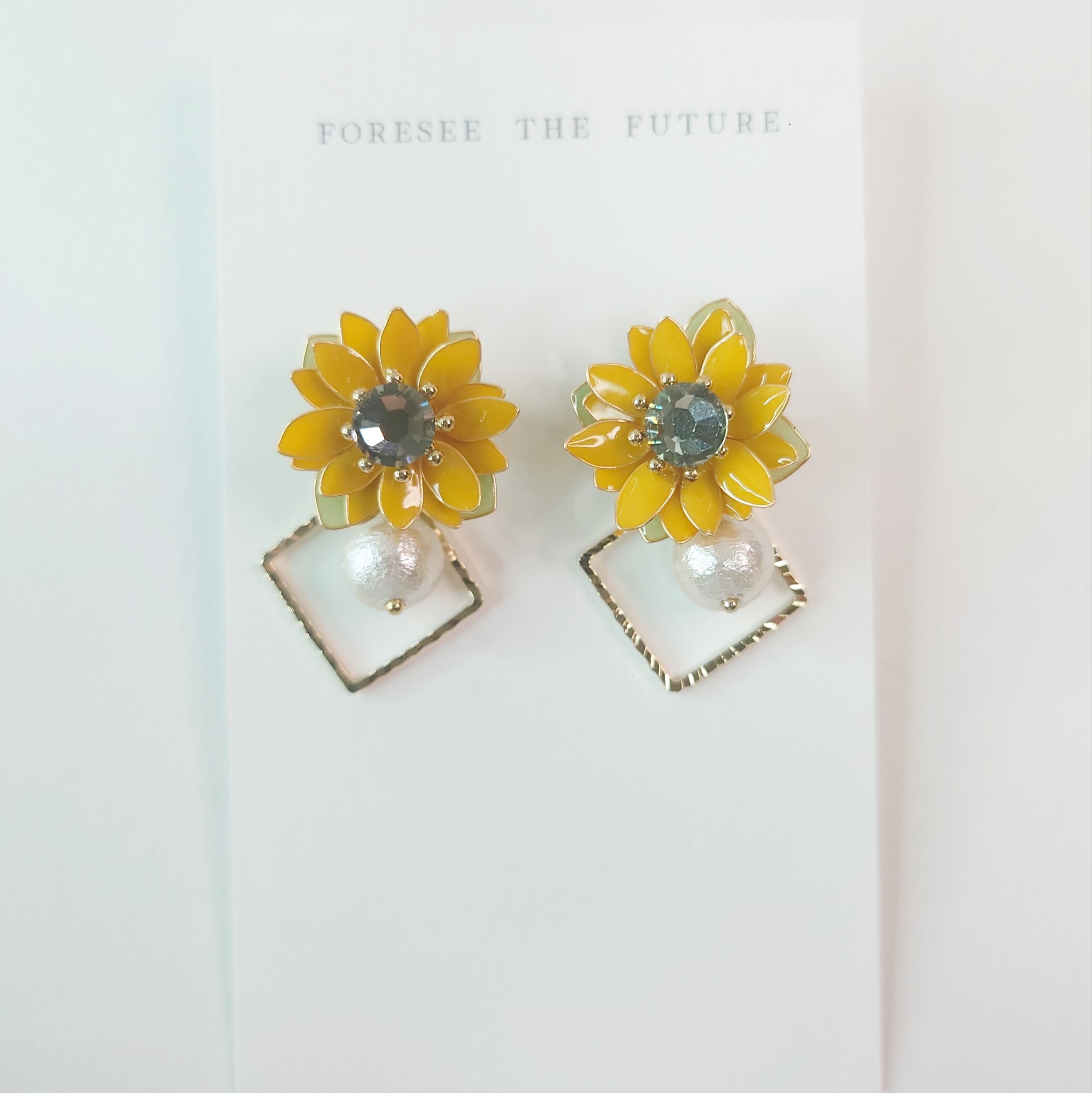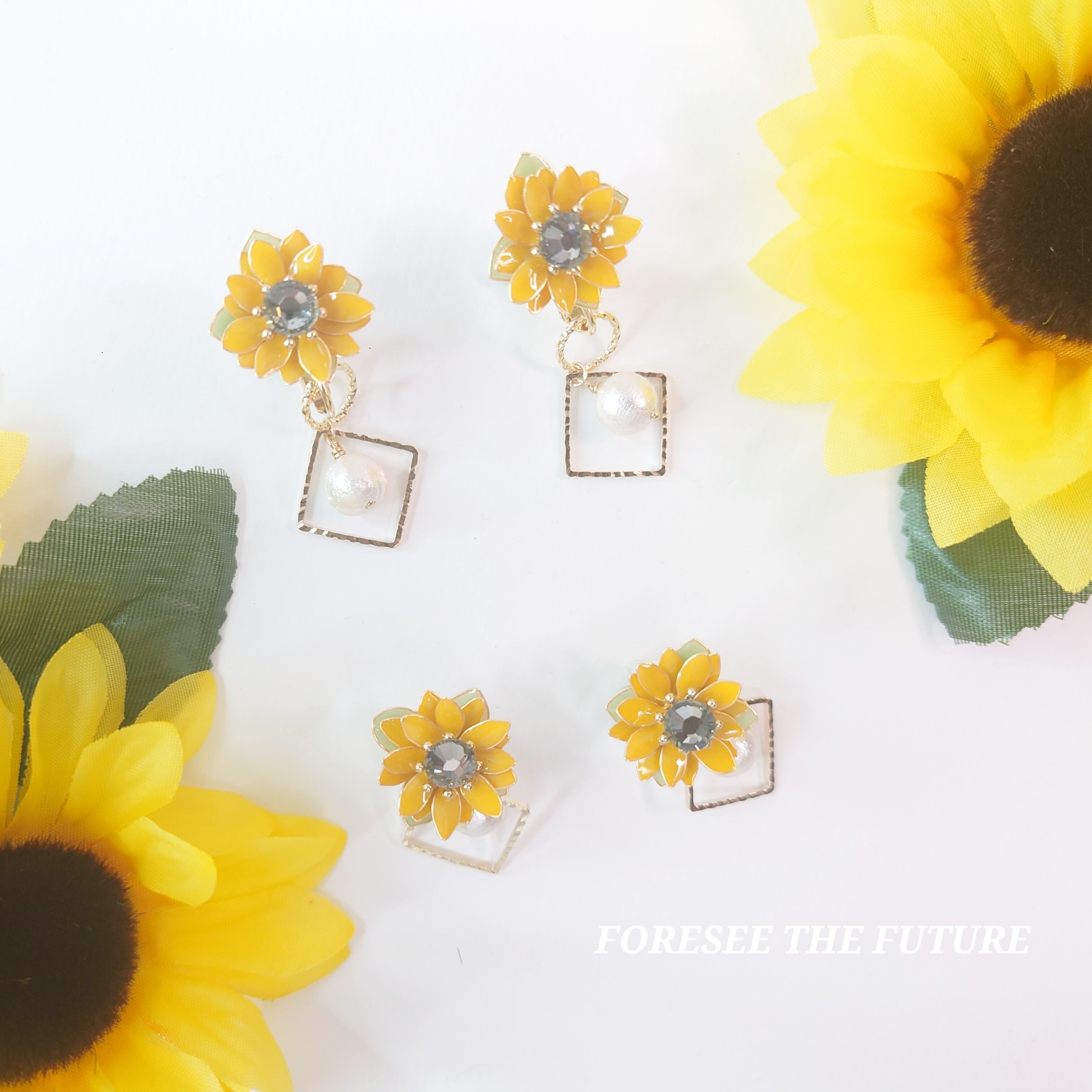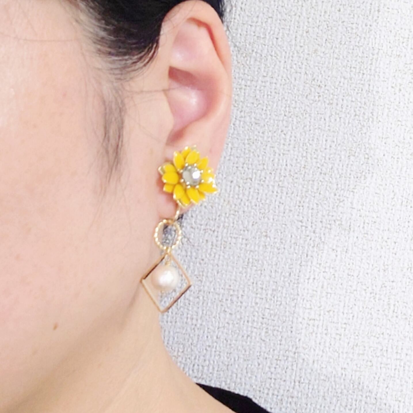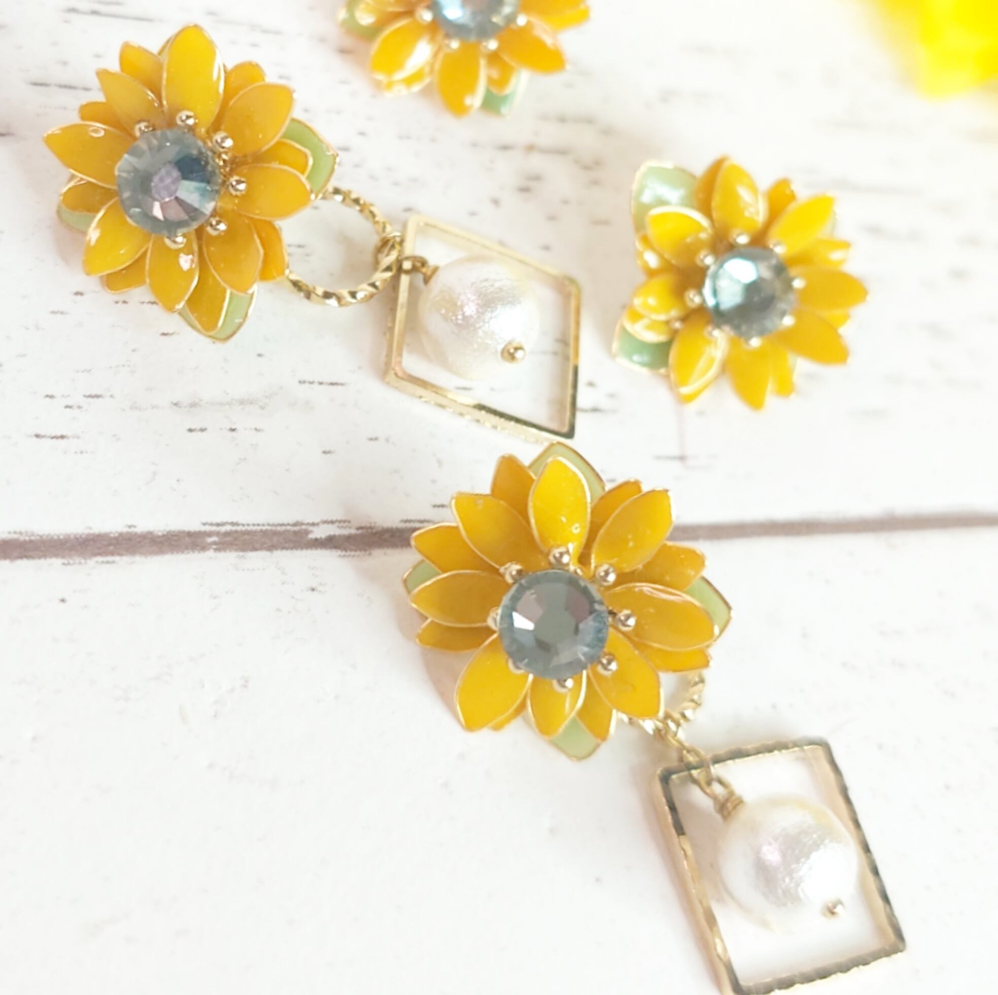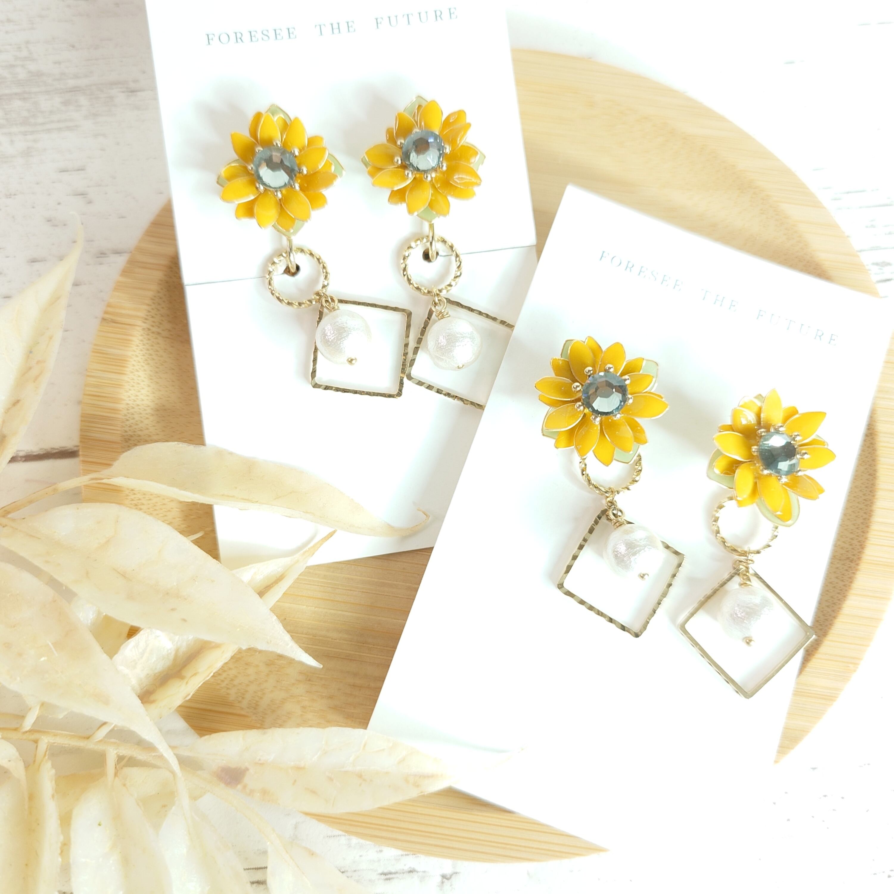 向日葵のイヤーアクセサリー【2wayスクエアタイプ】 ピアス/イヤリング/ディップレジン/ アメリカンフラワー/ワイヤー フラワー/ 花/ かわいい/お洒落 /