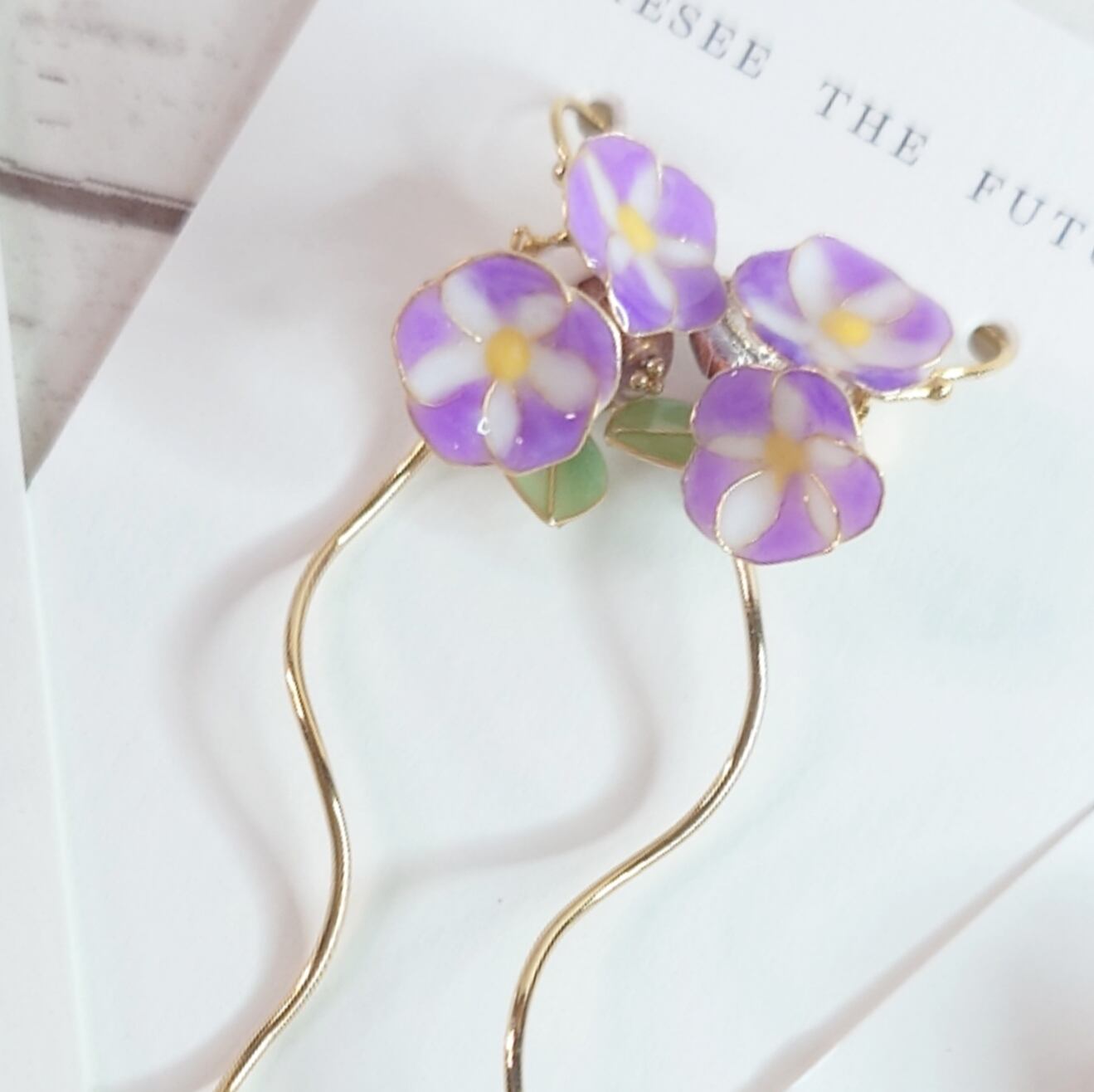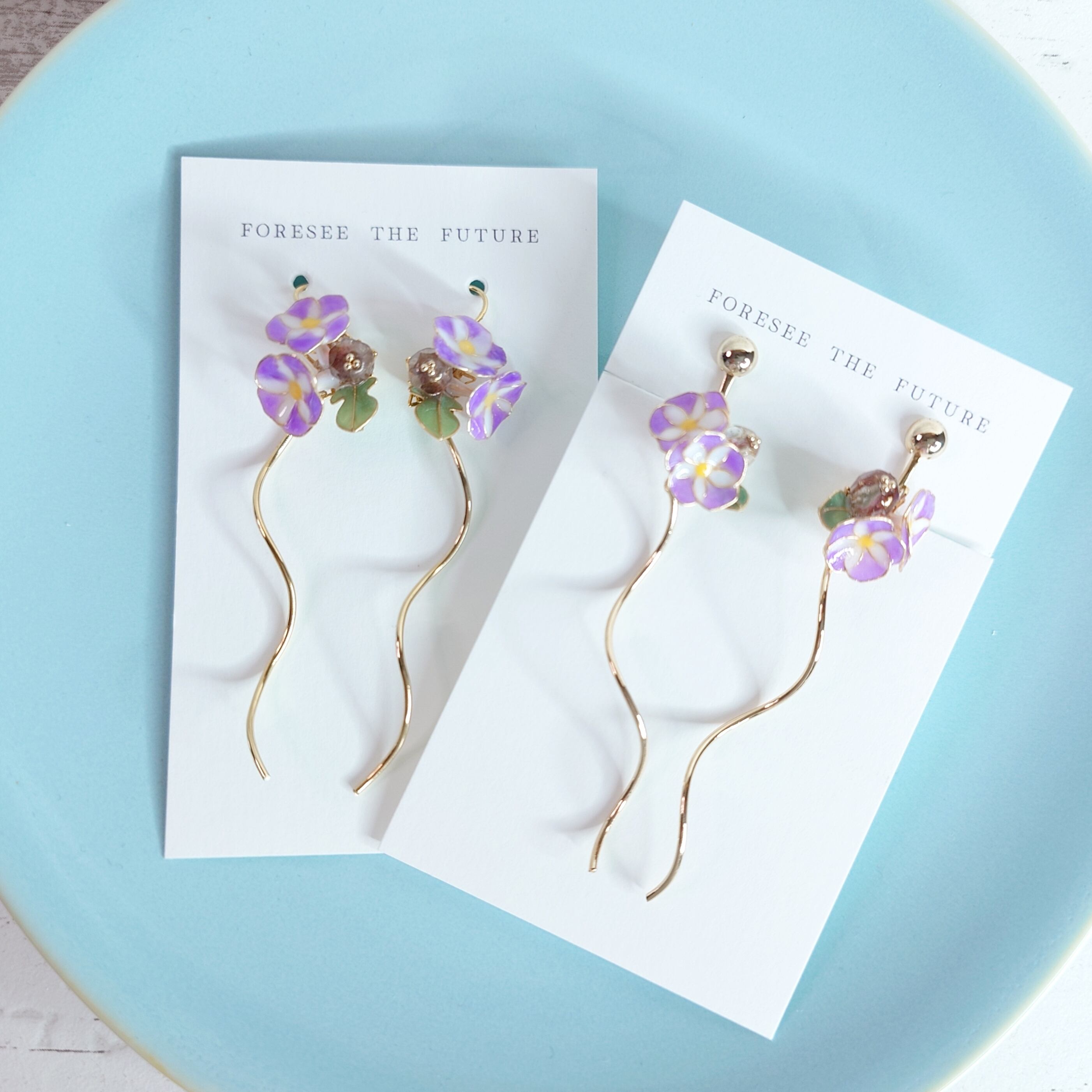 朝顔のイヤーアクセサリー【スイングヴァイン】(紫) ピアス/イヤリング/ディップレジン/ アメリカンフラワー/ワイヤー フラワー/ 花/ かわいい/お洒落 /